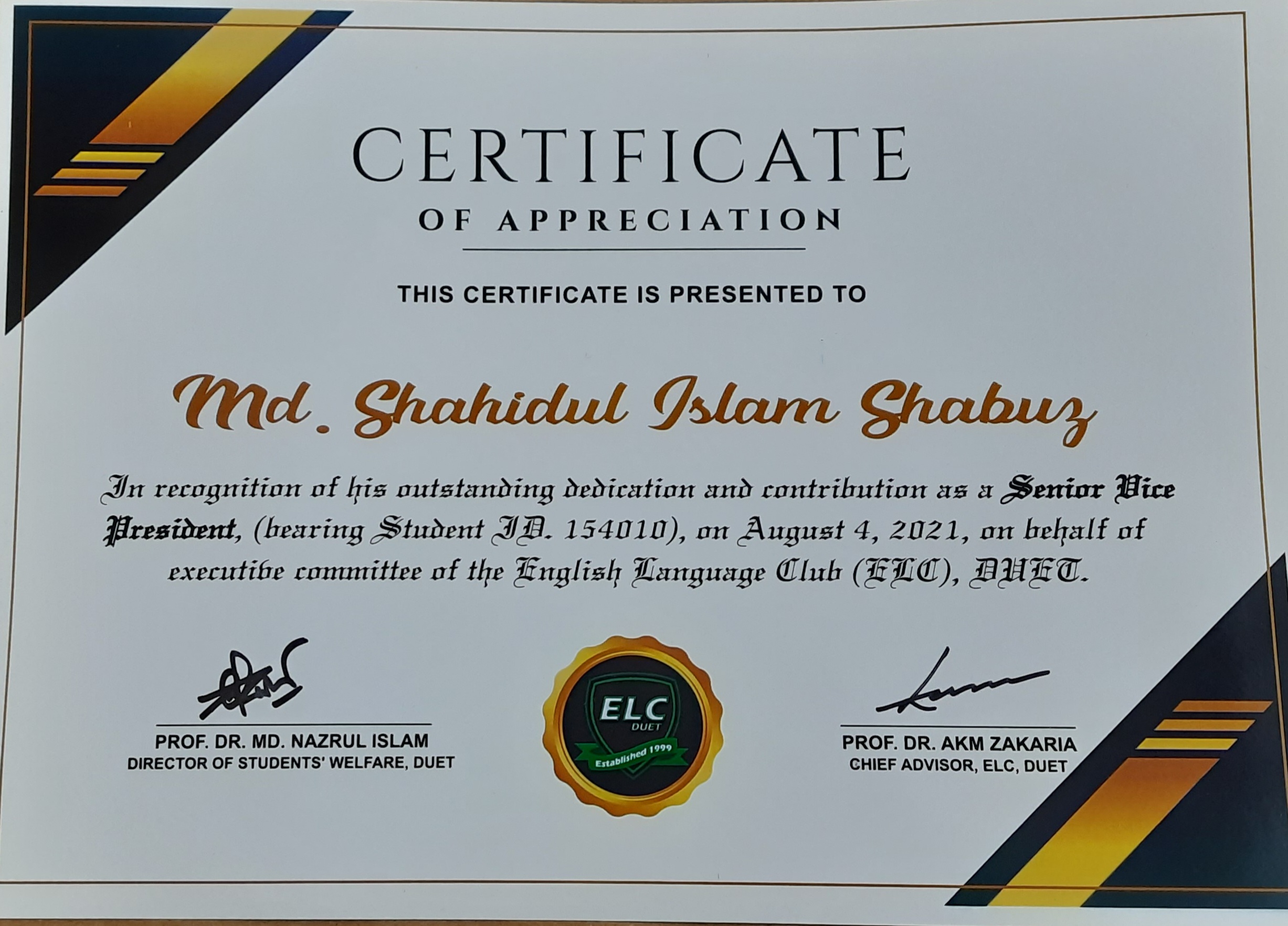Senior Vice President English Language Club(ELC),DUET (Certificate)